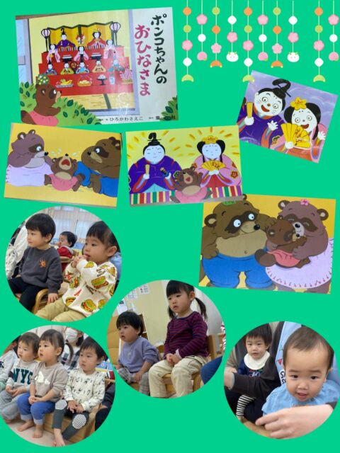 まず、紙芝居「ポンコちゃんのおひなさま」を見ました。ポンコちゃんのお家には、お雛様がありません…でもお雛様がほしいポンコちゃんは、泣いてしまいます😭その姿を見たお母さんとお父さんはどうしたでしょう…?