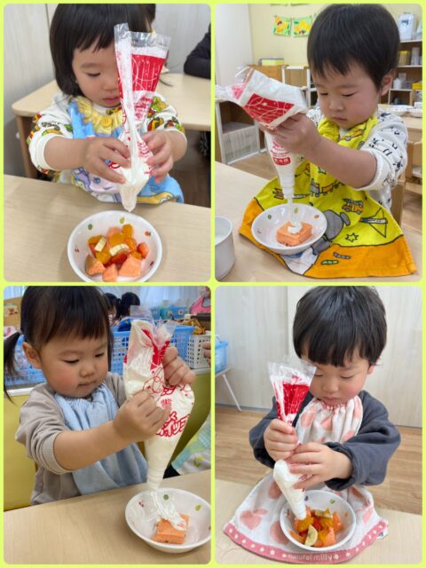 どのクラスも“にゅ~”っと出てくる生クリームに大喜び❤️