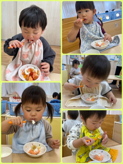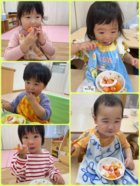 今日のおやつは、自分たちでトッピングしてケーキを完成させました🧁
