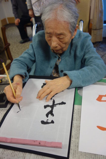 1月3日にお正月の書初めにちなんで施設では書道教室のレクリエーション活動を行いました。