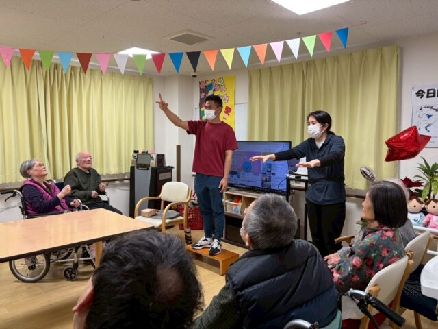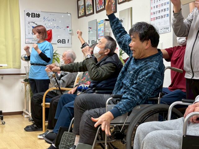 両腕を声かけと同じ方向に出す動きの時はみなさま「簡単ですね~」「できるできる~!」と余裕の表情でしたが、