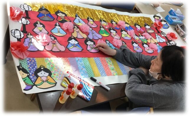 三段の雛壇に、お雛様の塗り絵をしていただき、
