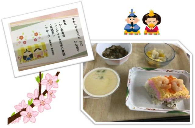 3月3日の昼食には目にも鮮やかな、《ひし形寿司》をご提供させていただきました😊😊😊