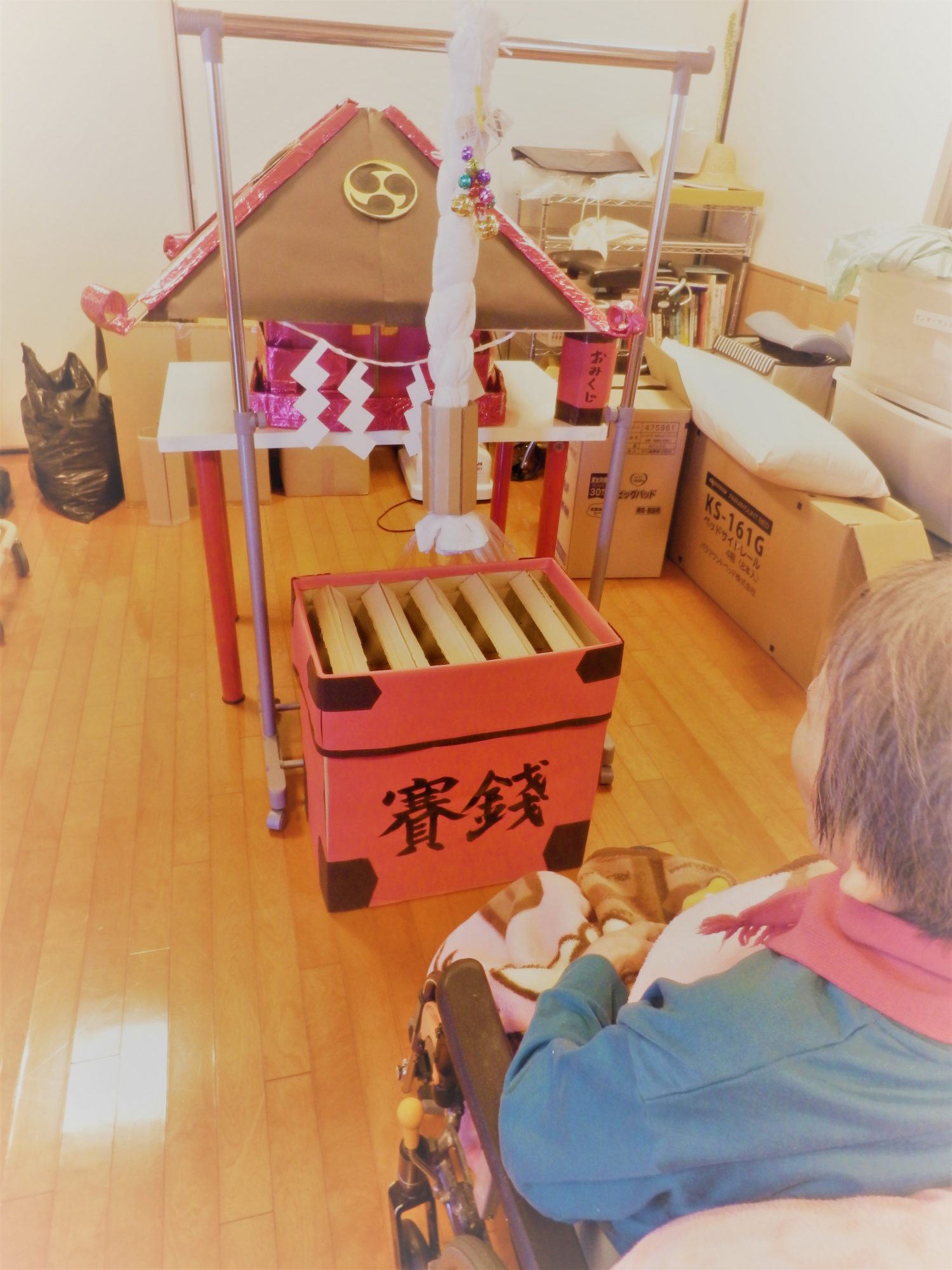 施設の玄関には、ご利用者様が作ってくださった七福神が飾られ、