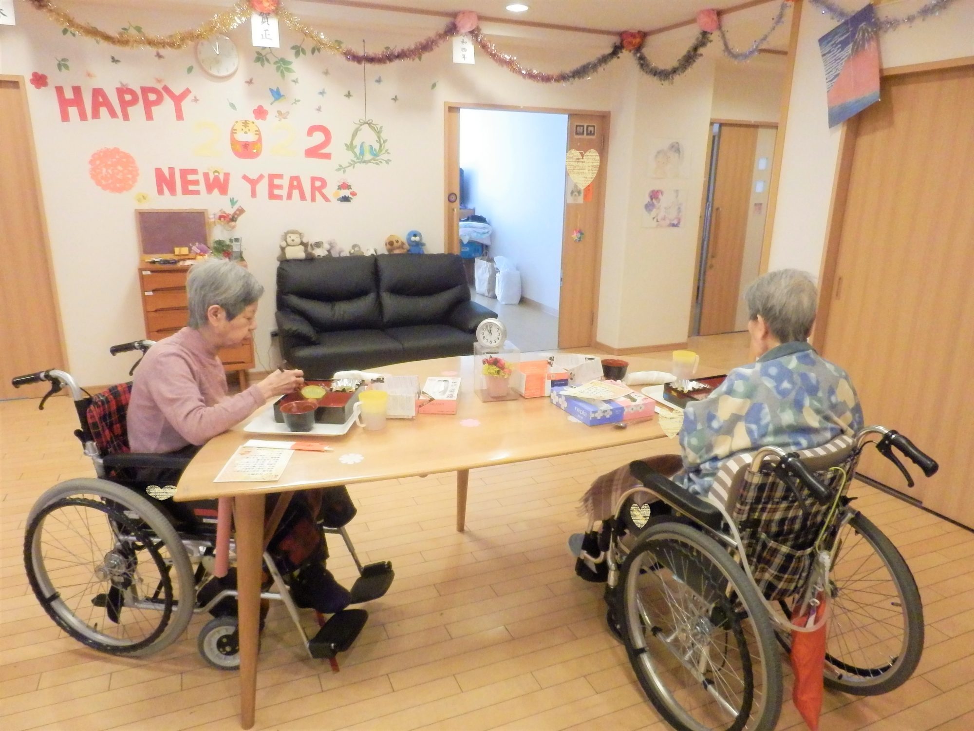 皆さん、お節料理や正月飾りを見ながら