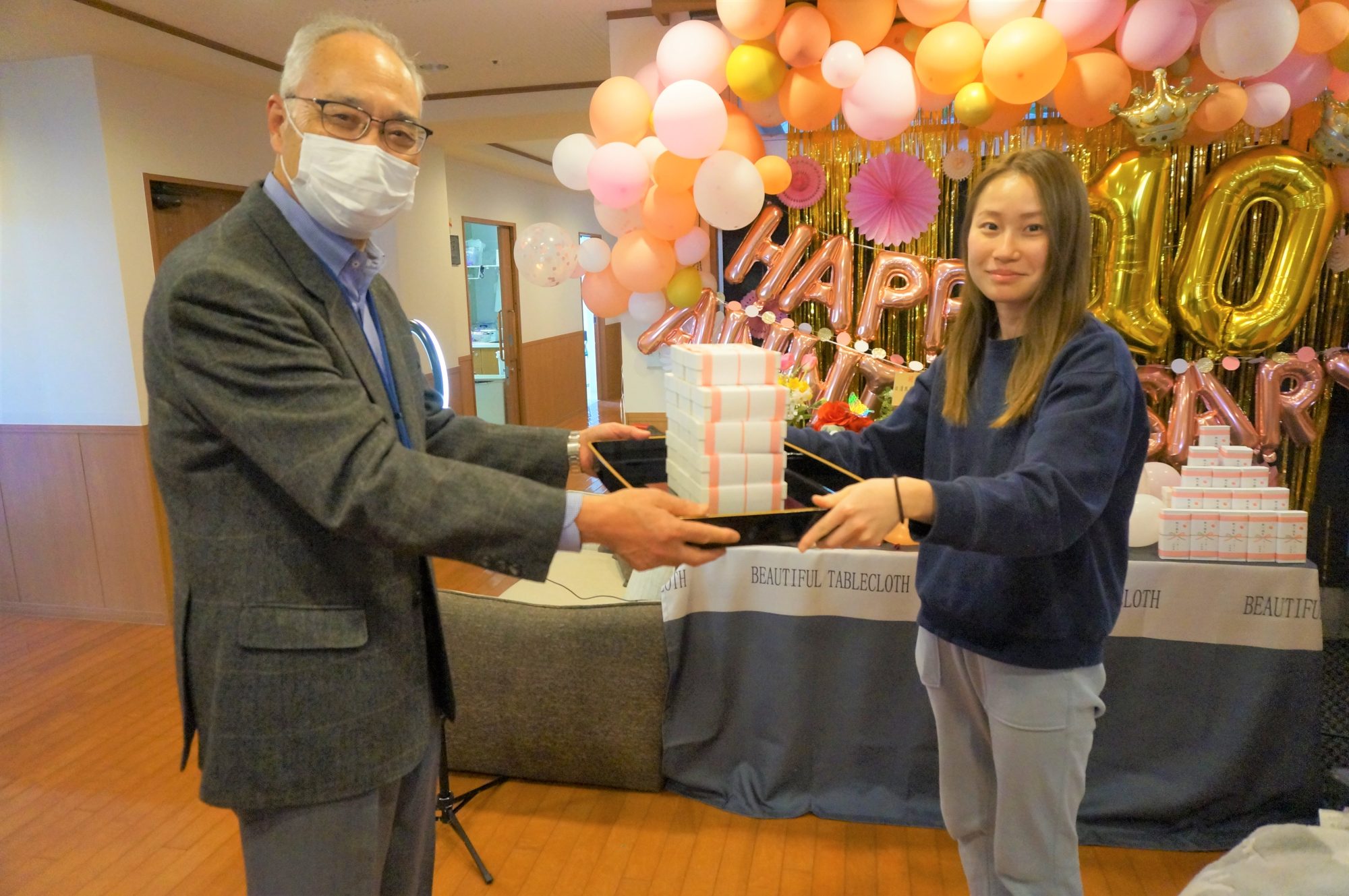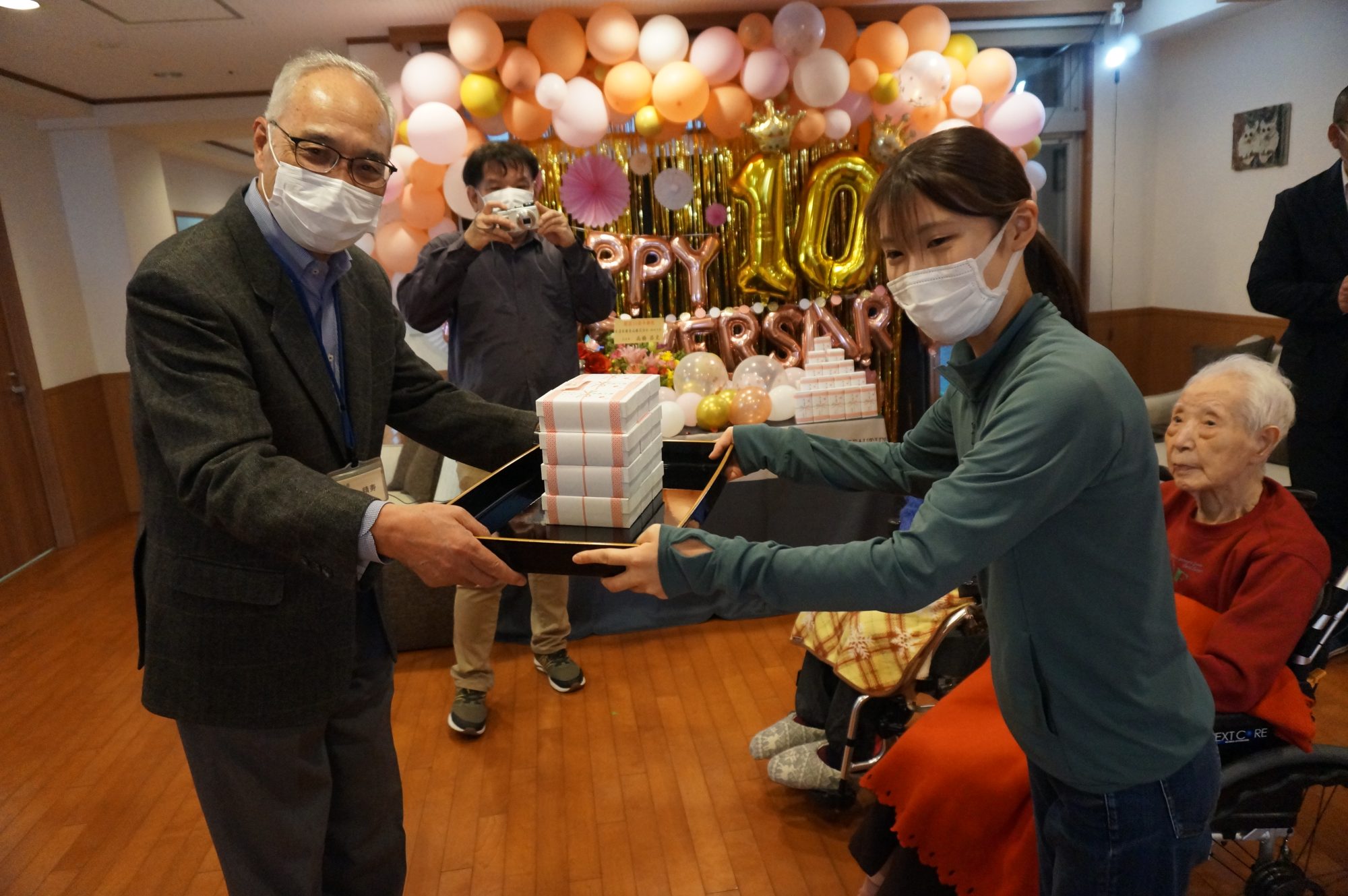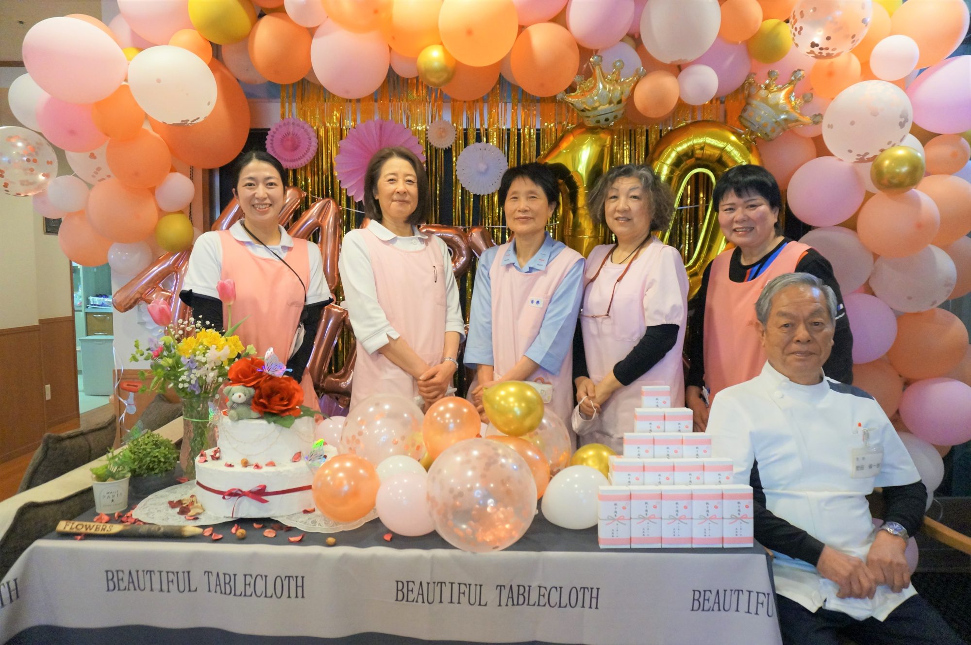 当日は10周年を祝うための飾付や豪華な食事、おやつには記念品の紅白饅頭が