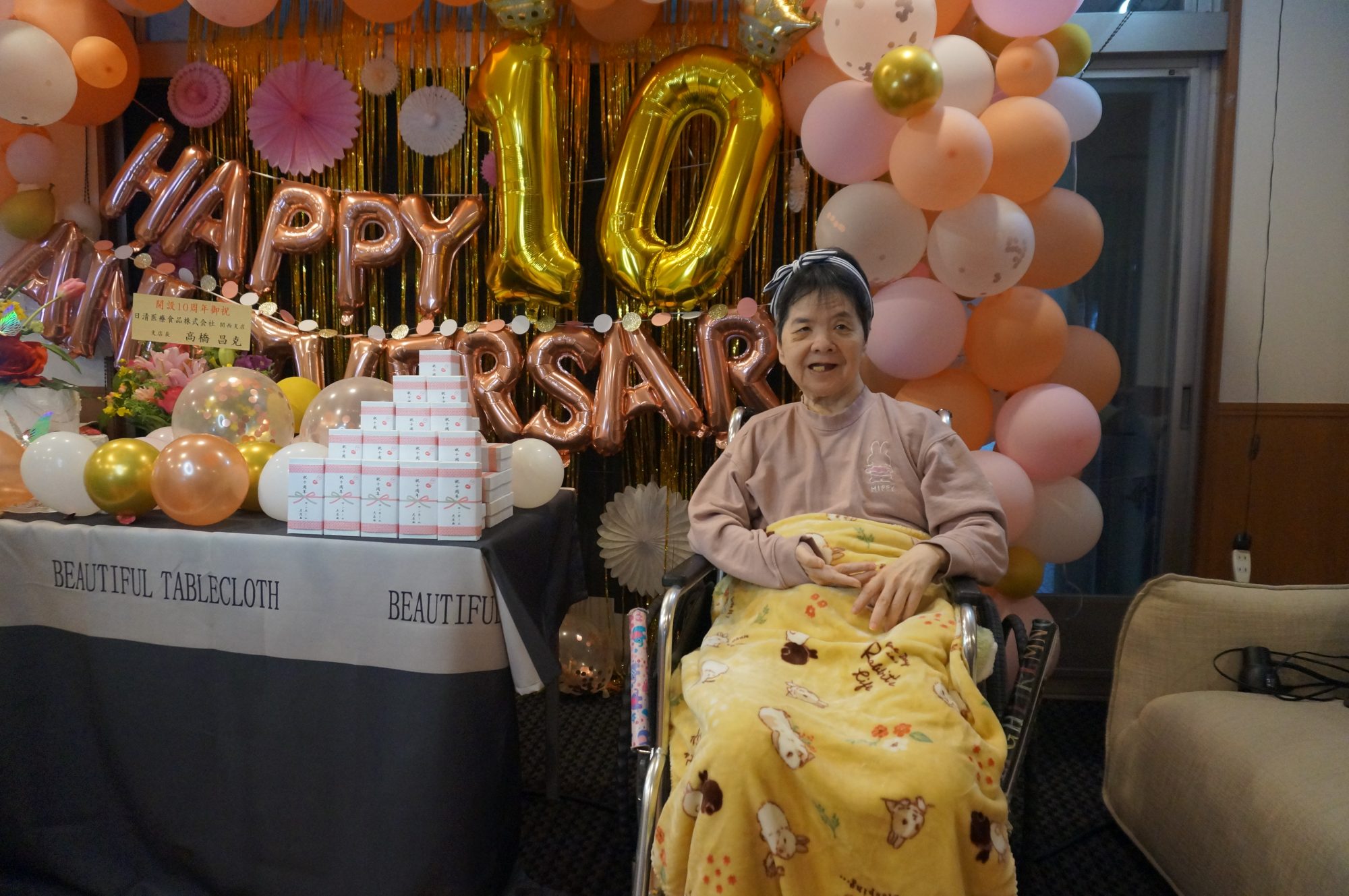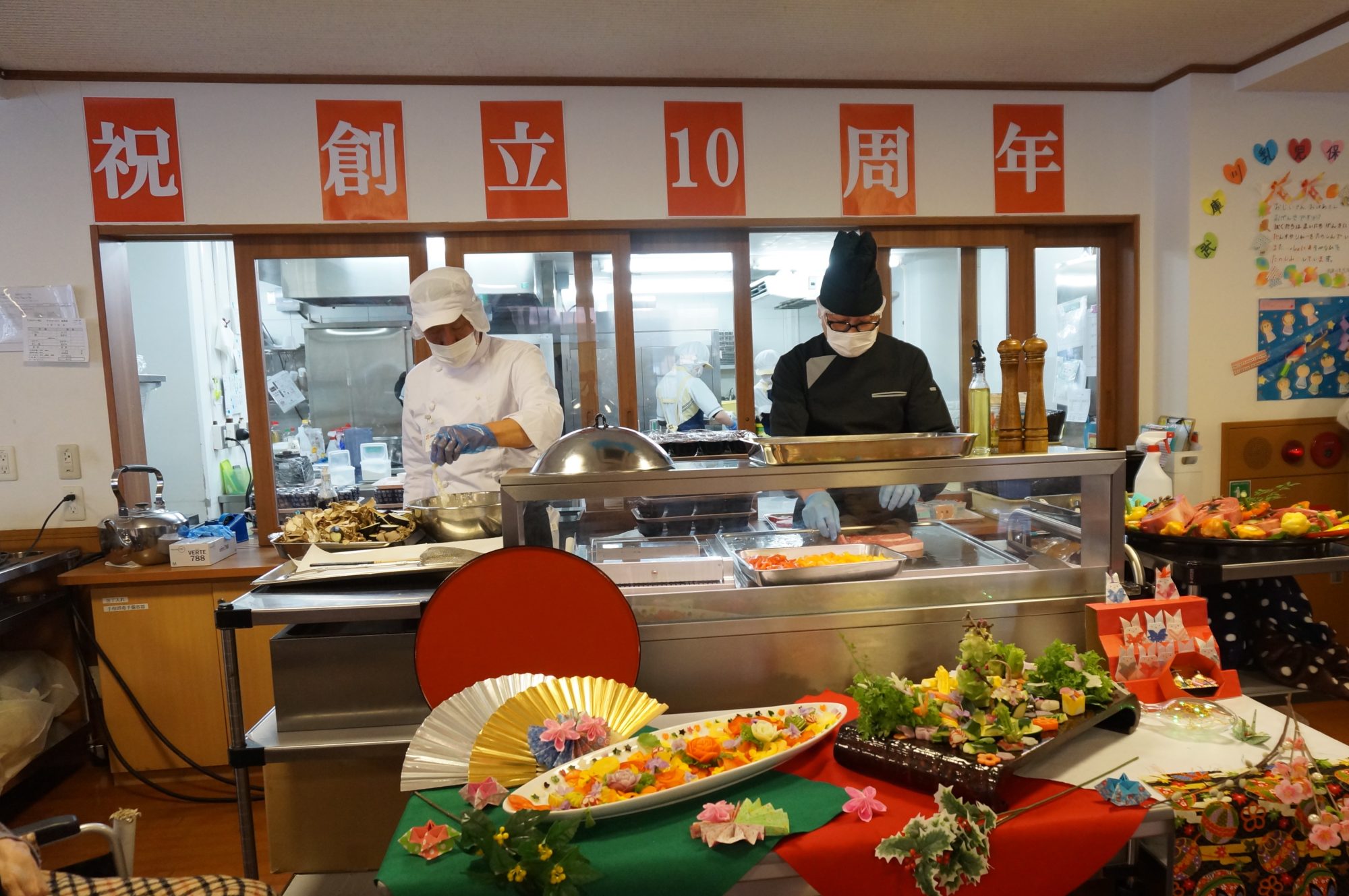 当日は10周年を祝うための飾付や豪華な食事、おやつには記念品の紅白饅頭が