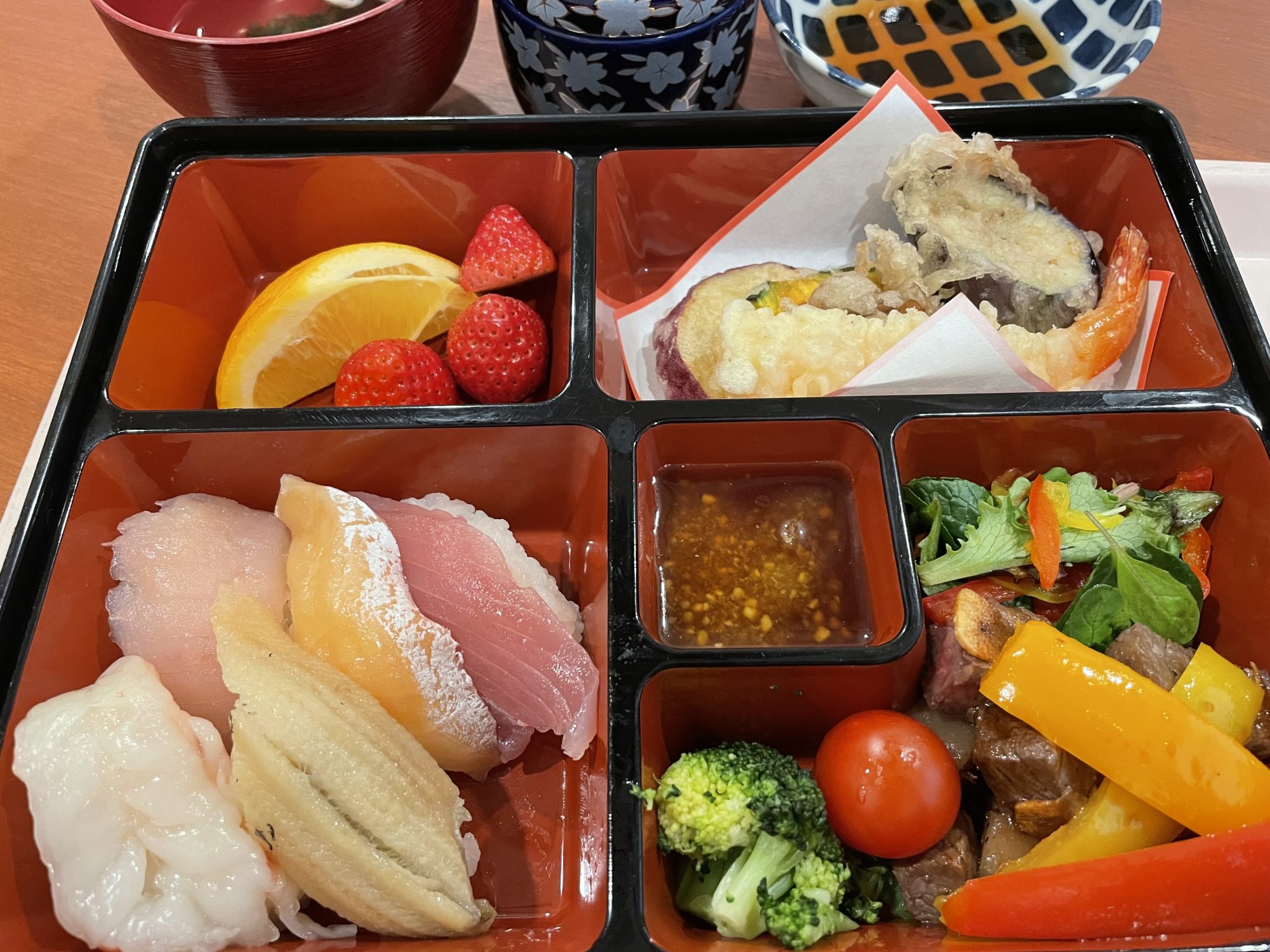 皆様、やっと手元に届いたお肉やてんぷら、お寿司を