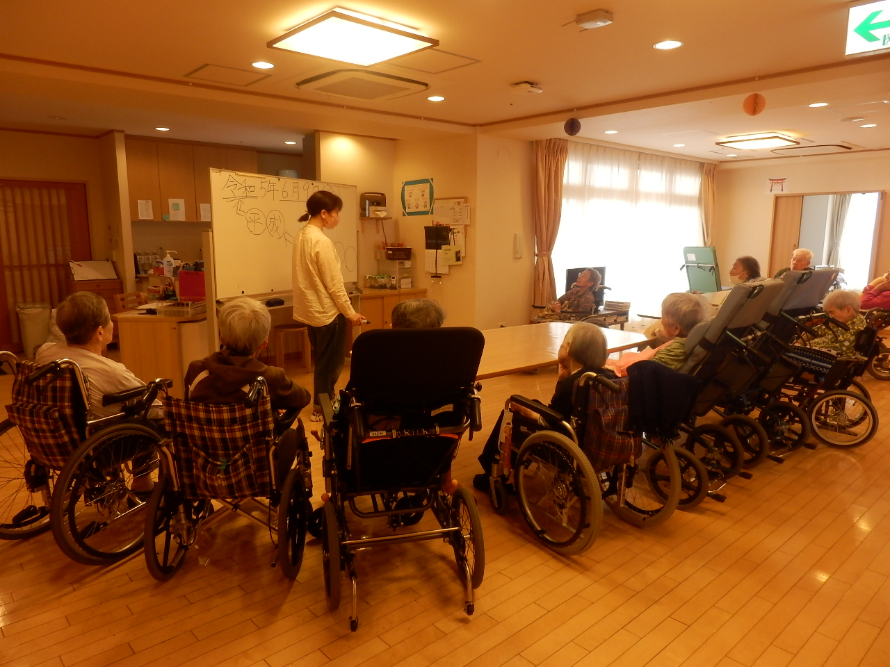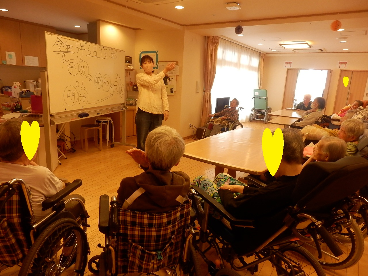 まずは理学療法士より体操前にお話しをしてくれます。この日は6月9日で天皇皇后両陛下の結婚記念日でした。
