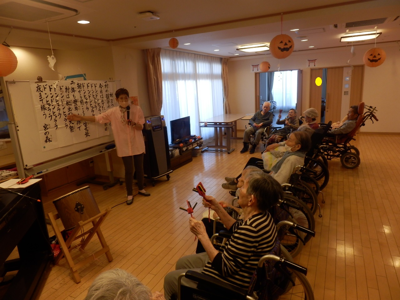 「こんなん歌ったことないわ」と言っている入居者様も曲が流れ始めるとノリノリで歌い出していました!「懐かしいな」「この曲聞いた事あるわ」との声も聞こえました。