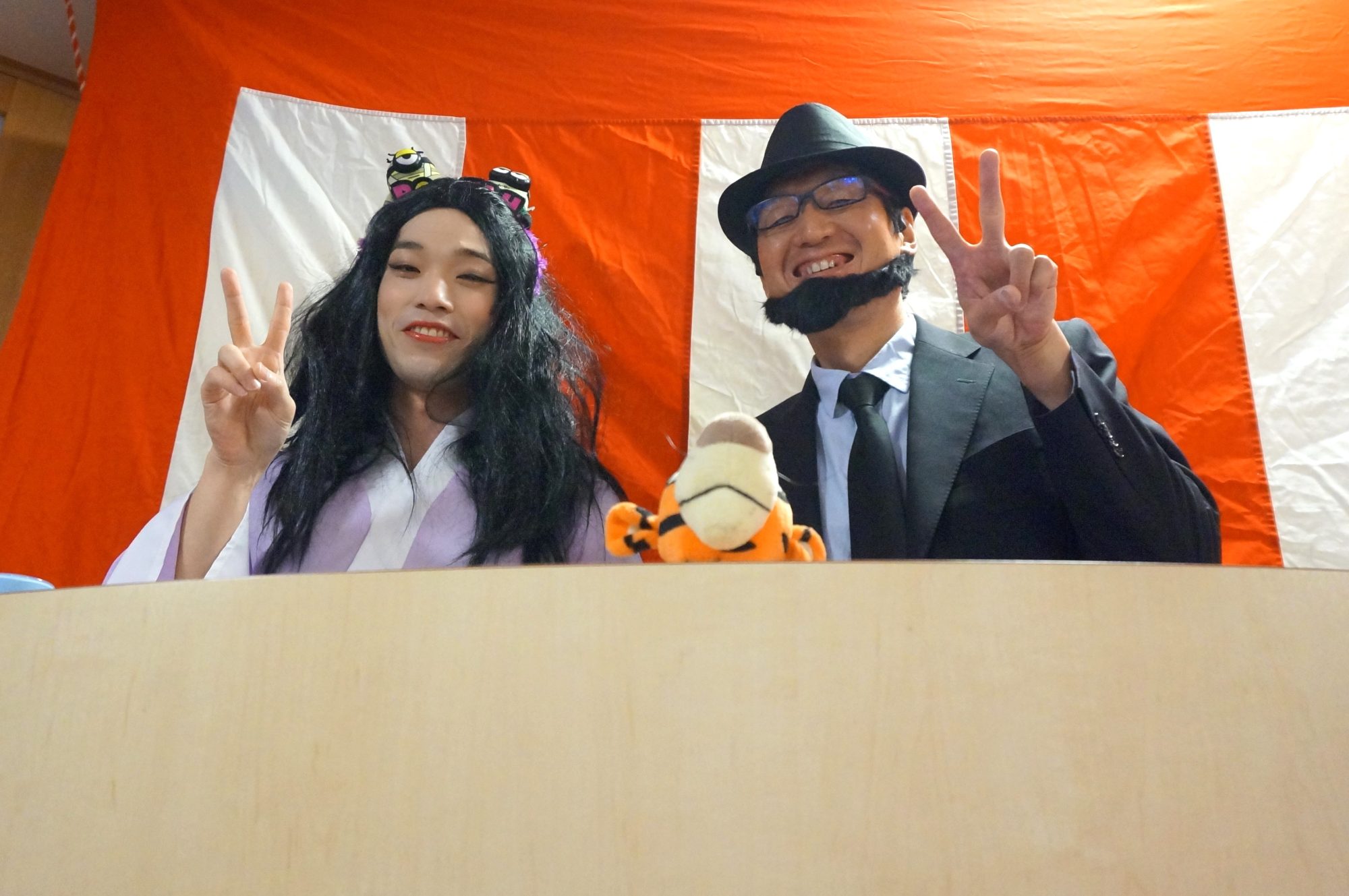 二人羽織は、二人一組で羽織を肩から羽織った人の背後にもう一人が袖を通し