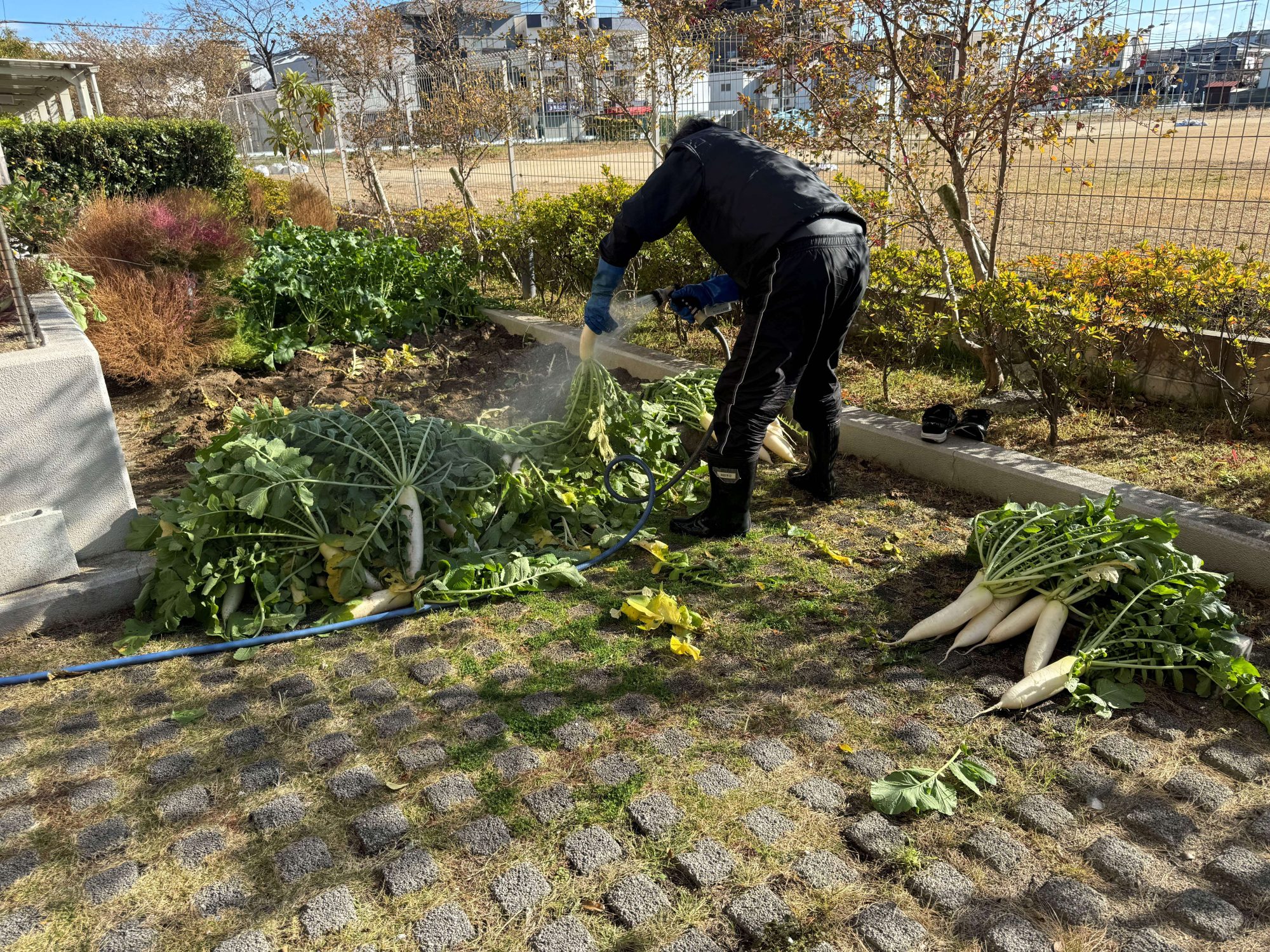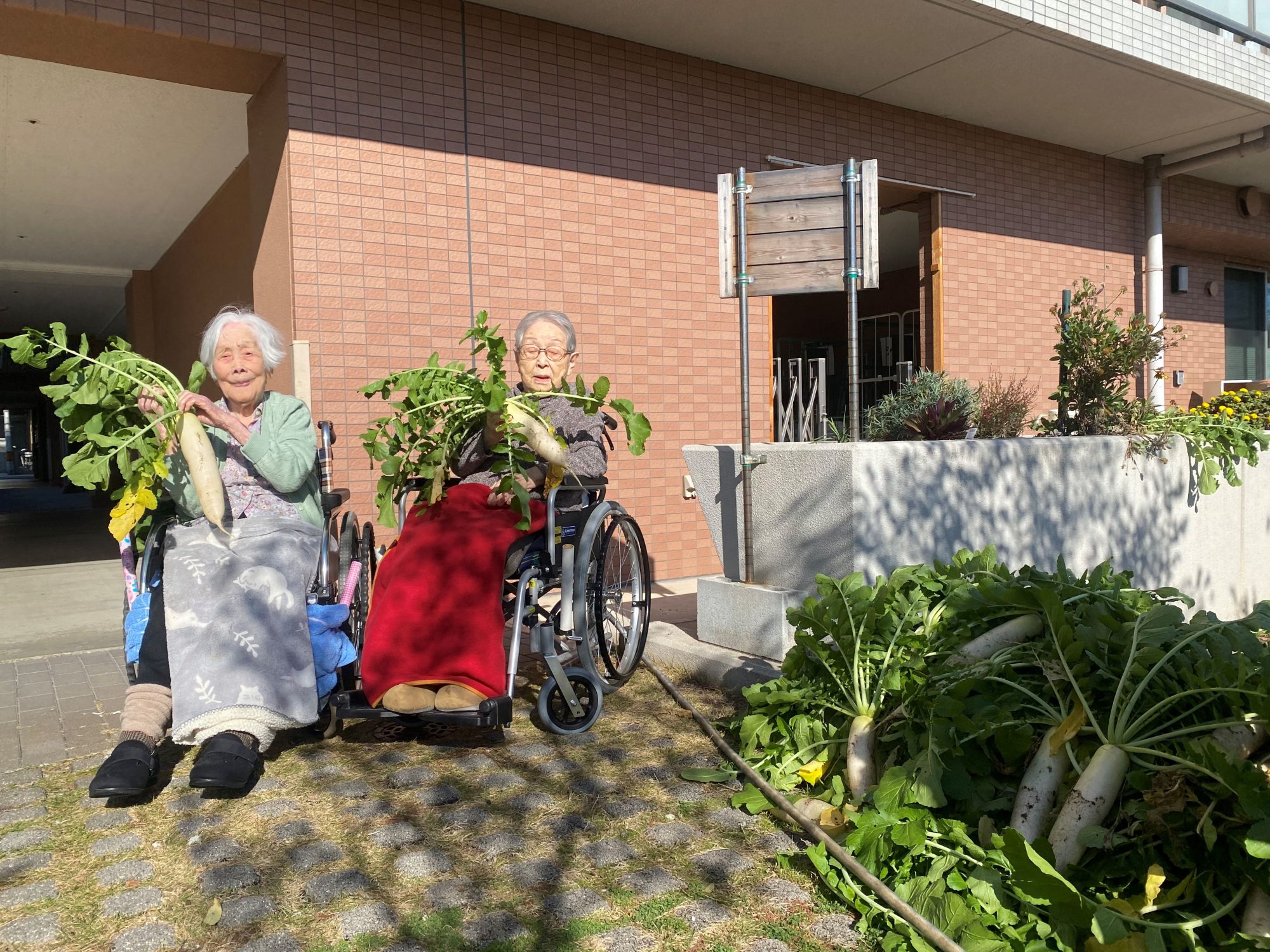 (↑ K運転手が日々愛を注ぎ続けた大根を収穫中😆)(↑ 大根の大きさに利用者様もこの笑顔😊)