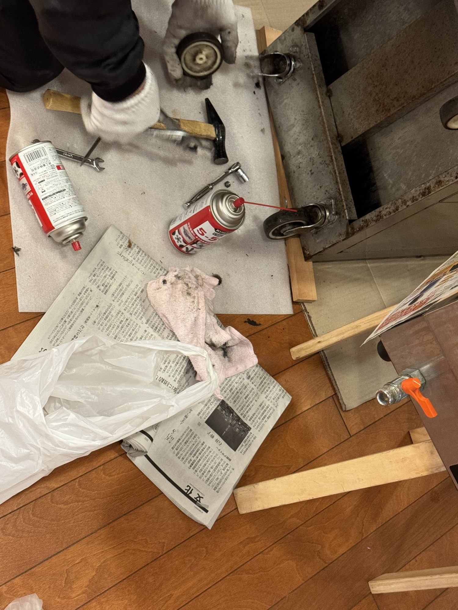 (↑ いつも食事を運んでくれる配膳カートの車輪をメンテナンス中🔨 ↑)