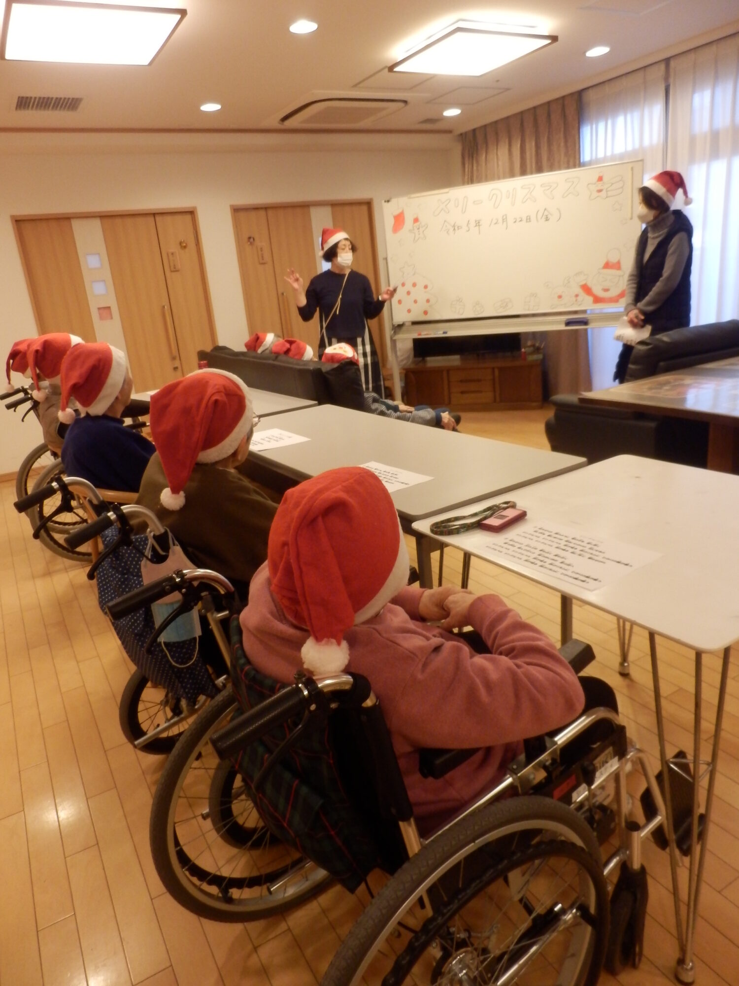 こちらはショートステイのクリスマス会の様子です!皆様サンタクロースになりきり、クリスマスにちなんだクイズに答えておられます!