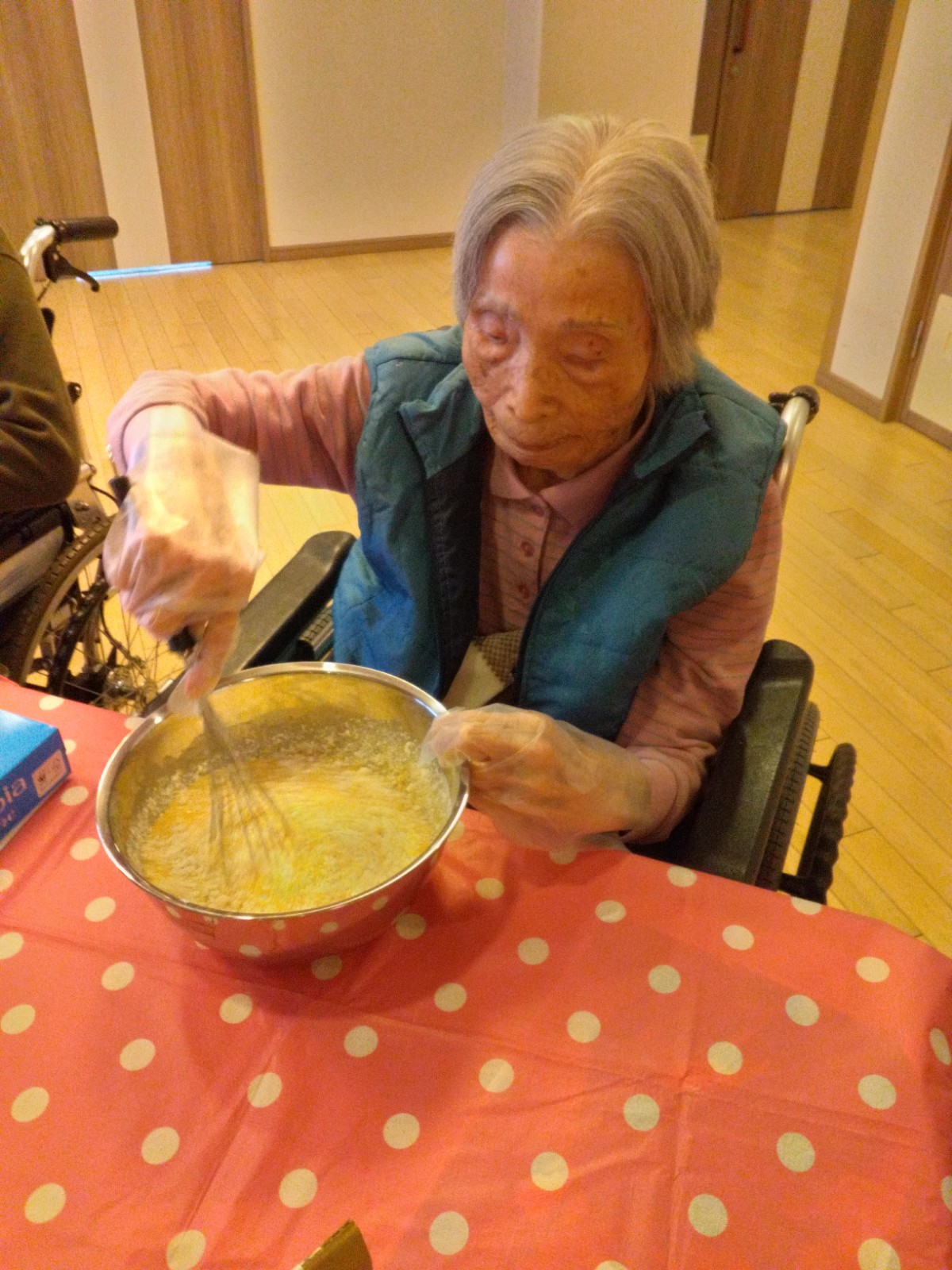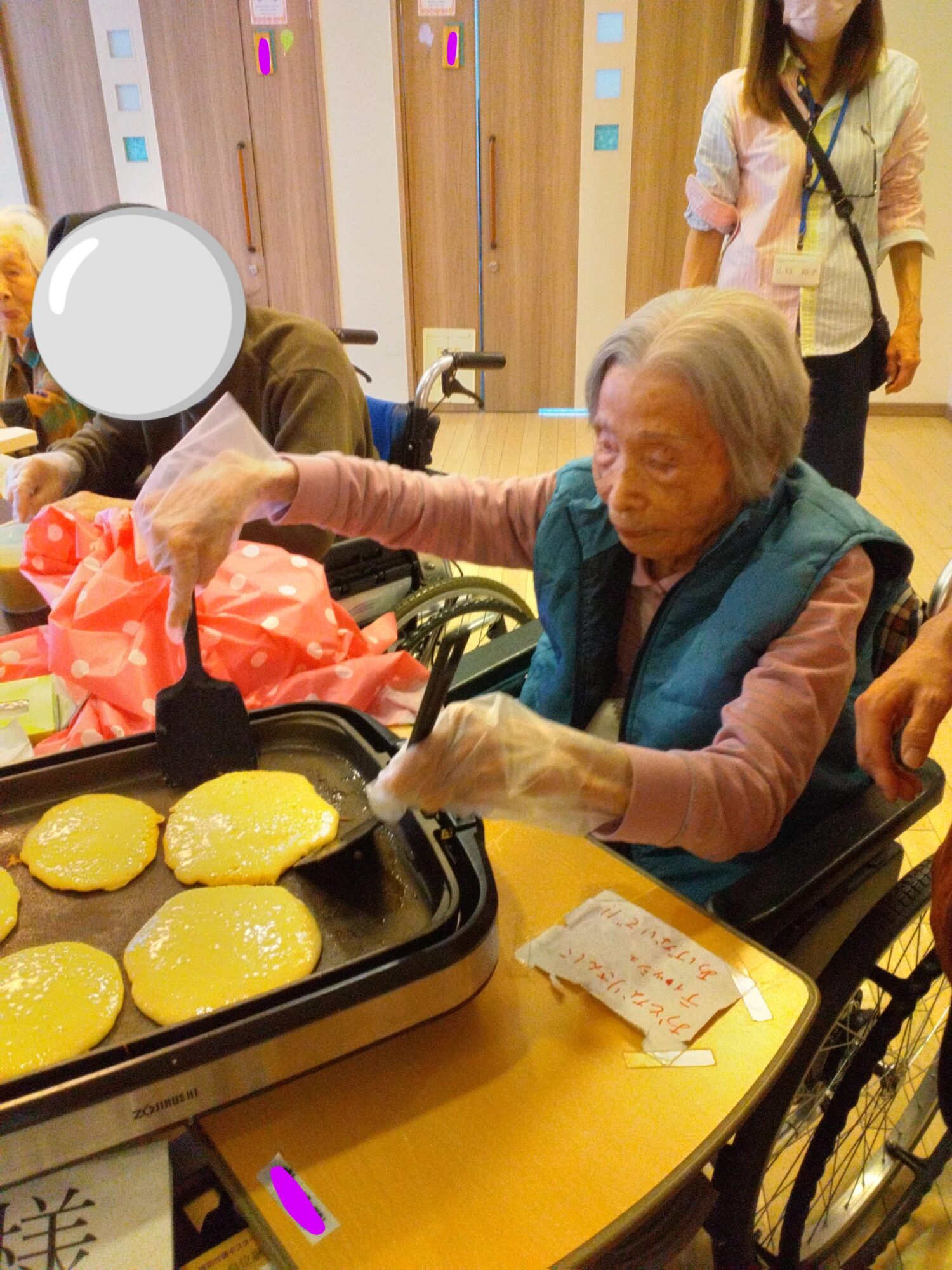 栄養管理士と入居者様と共同作業で1から作り大量の生地を泡立て器で混ぜ、生地を鉄板に流し様子を見ながらへらでひっくり返したりと皆さん久しぶりの料理作りにワクワク楽しそうにしながら作業をされていました!