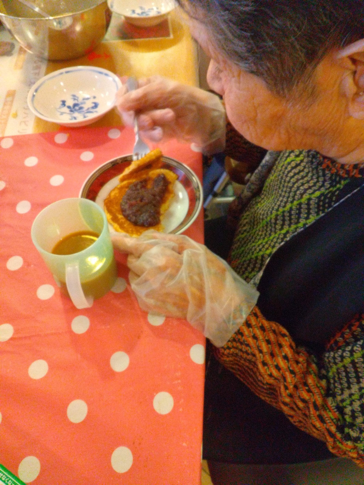 大きなどら焼きができ、皆さん満面の笑みで美味しそうに召し上がっておられ最高のおやつ作りができたかと思います!
