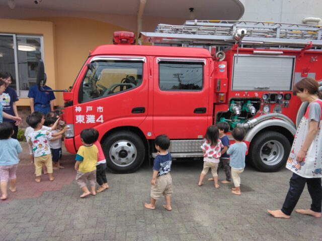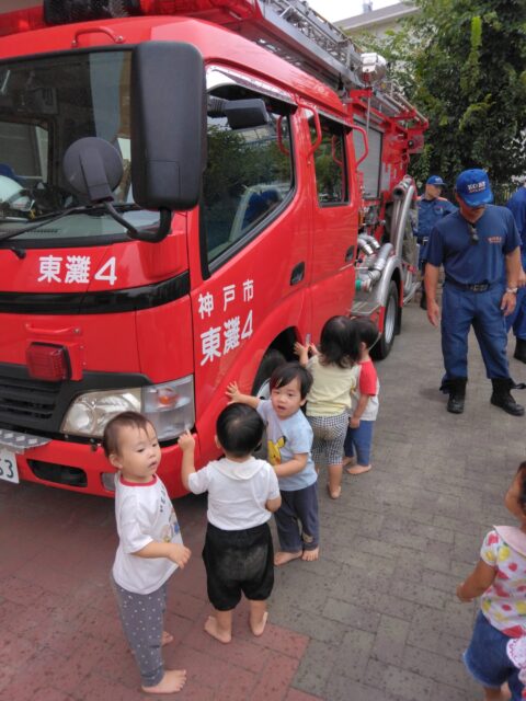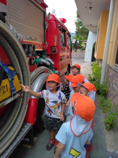 避難や消防車の見学、消火訓練を消防署の皆様に見守られながら行いました。