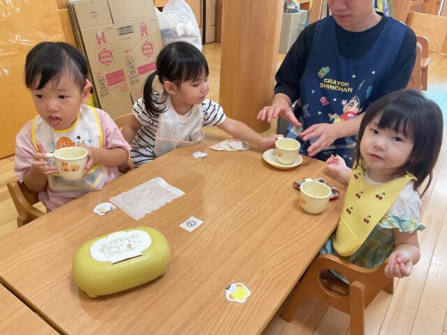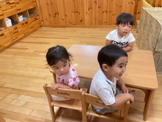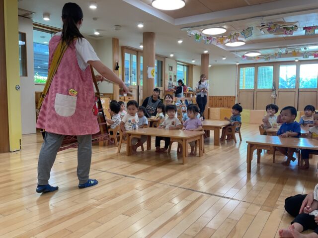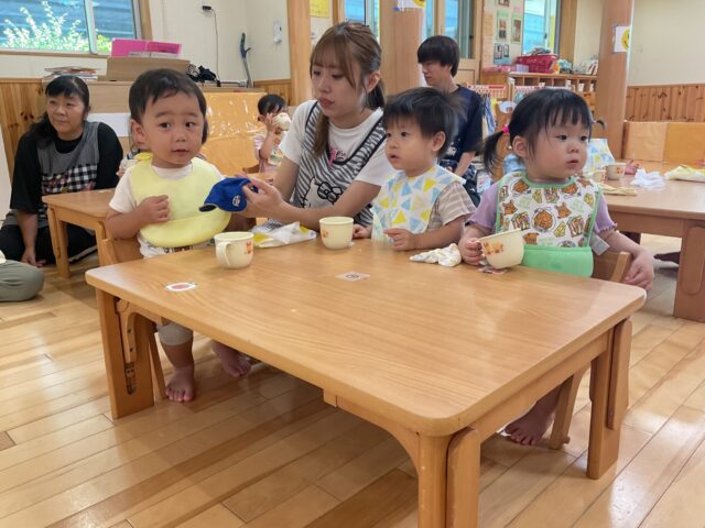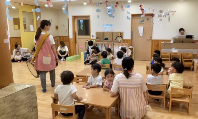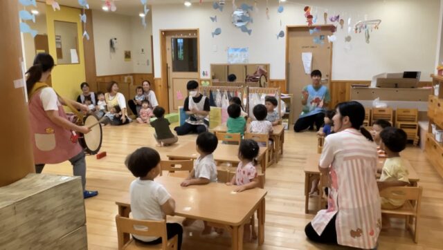 1歳児クラスのもも組さんは、太鼓とピアノの音楽を聴きながら