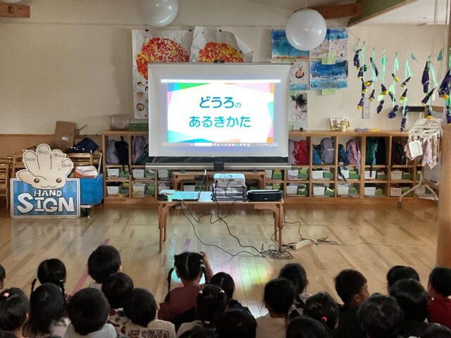 最初に【どうろのあるきかた】のビデオをみんなで見てお話を聞きました。