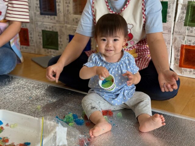 そんな中、0歳児クラスさんでは、ちょっぴり涼しくなる?感触あそびをしてみましたよ👐