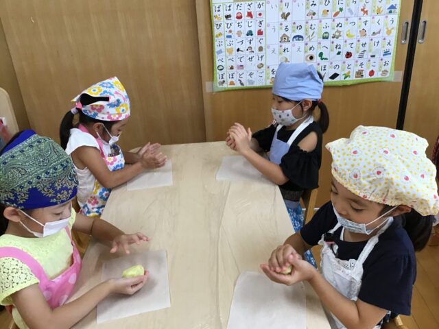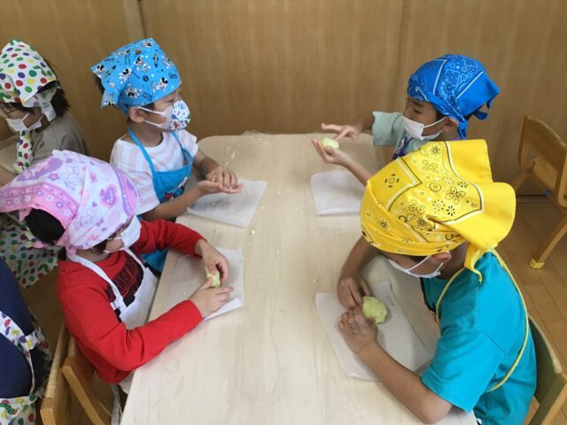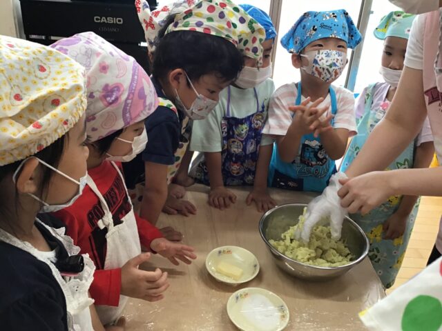 保育園に戻って食育「スイートポテトづくり」をしました。